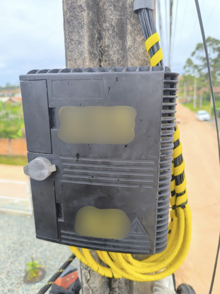 Caixa de atendimento FTTH com excesso de cabos externos e sem organização interna adequada, comprometendo o padrão técnico e manutenção da rede